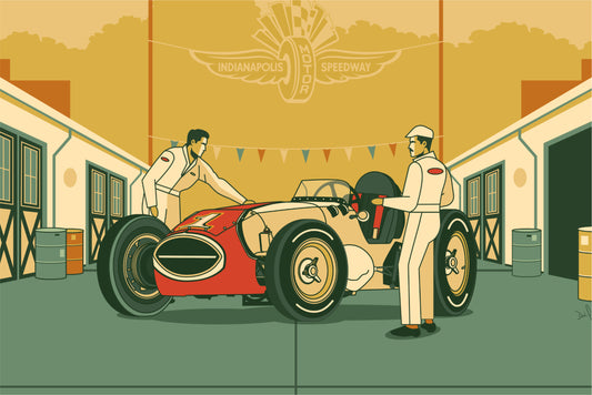 Indianapolis Motor Speedway® "The Garage of Champions - Gasoline Alley" Retro Wall Art Print